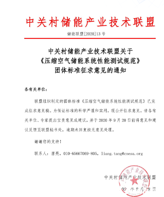 中關村儲能產業(yè)技術聯(lián)盟關于《壓縮空氣儲能系統(tǒng)性能測試規(guī)范》團體標準征求意見的通知