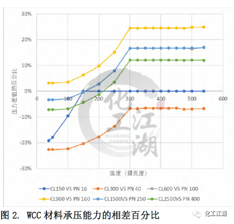 (2)對于ASME的 Class 300和EN12516-1 的PN40,在整個(gè)溫度的范圍內(nèi),EN標(biāo)準(zhǔn)規(guī)定的材料承壓能力均低于ASME標(biāo)準(zhǔn)規(guī)定的材料承壓能力。當(dāng)溫度低于300攝氏度時(shí),隨著溫度升高,差距逐漸縮小。當(dāng)溫度高于300攝氏度時(shí),兩個(gè)標(biāo)準(zhǔn)對相同材料的承壓能力的規(guī)定差別趨于一致,約為-7%。