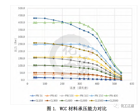 無論是ASME標(biāo)準(zhǔn)還是EN標(biāo)準(zhǔn)都列出了一些ASTM標(biāo)準(zhǔn)材料的壓力溫度等級,即材料在不同溫度下的承壓能力。本文選取了常見的閥體材料:碳鋼WCC,合金鋼 WC9和C12A進(jìn)行研究,來對比兩個(gè)標(biāo)準(zhǔn)中相同材料在標(biāo)準(zhǔn)壓力等級下的承壓能力的差別。