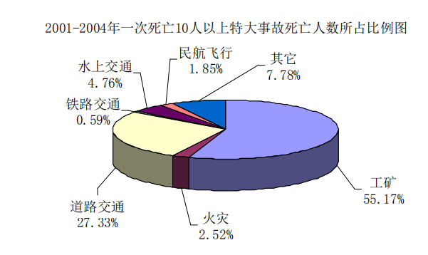 2001年平均 2.5天發(fā)生一起一次死亡10人以上特大事故,2002年-2004年平均2.8天發(fā)生一起一次死亡10人以上事故。其中: