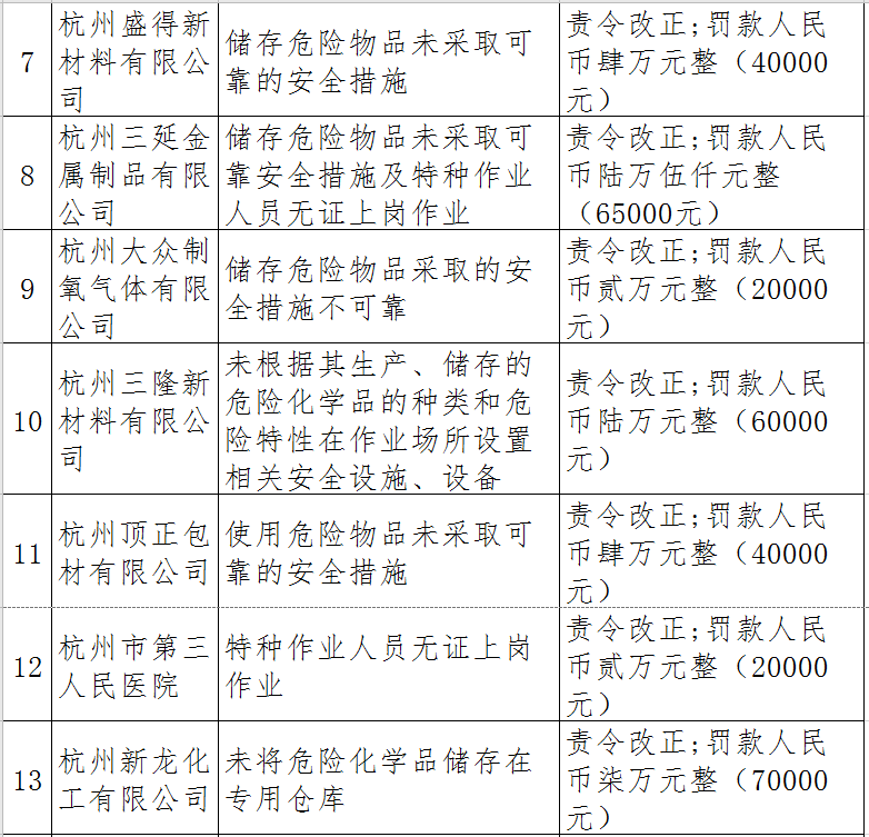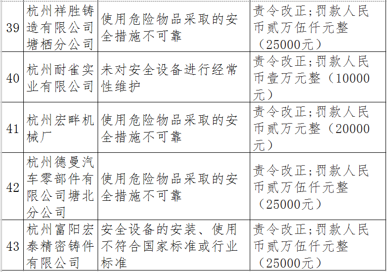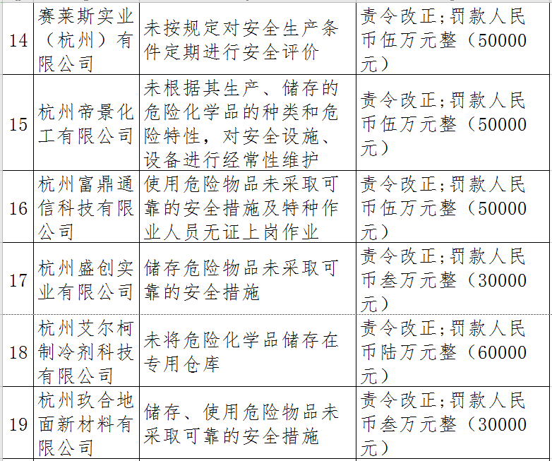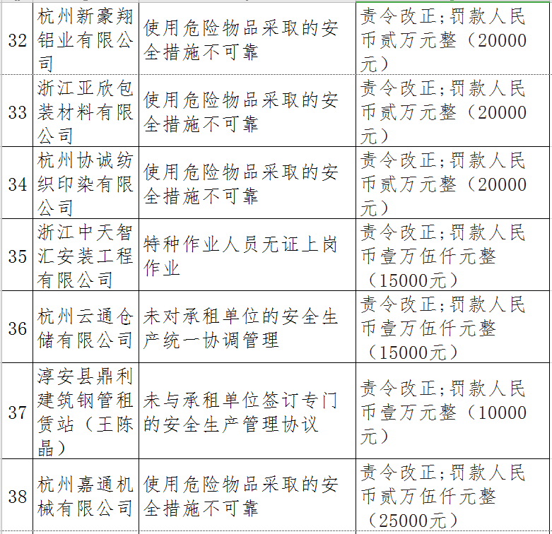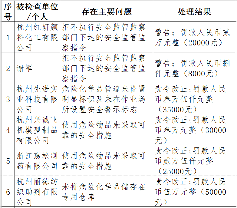 據(jù)了解,今年上半年,杭州市應(yīng)急管理局一手抓駐企復(fù)工復(fù)產(chǎn)、一手抓安全生產(chǎn),已完成年度執(zhí)法計(jì)劃、專(zhuān)項(xiàng)檢查、聯(lián)合執(zhí)法、信訪舉報(bào)核查等,并對(duì)檢查中發(fā)現(xiàn)的安全生產(chǎn)違法違規(guī)企業(yè)(個(gè)人)進(jìn)行了處罰?,F(xiàn)對(duì)52家被行政處罰的企業(yè)(個(gè)人)進(jìn)行曝光,希望各企業(yè)引以為戒!