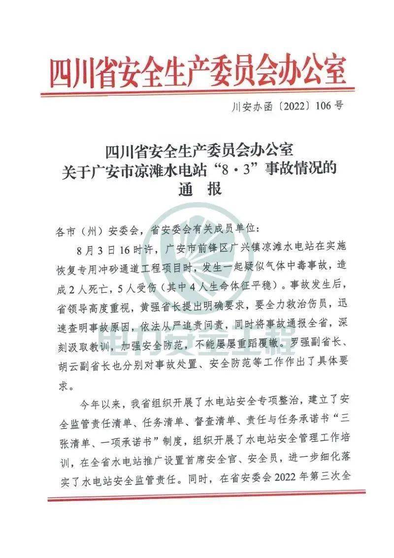 2022年8月3日,四川省廣安市前鋒區(qū)廣興鎮(zhèn)涼灘水電站在實施恢復專用沖砂通道工程項目過程中,發(fā)生中毒事故,造成3人死亡,4人受傷。