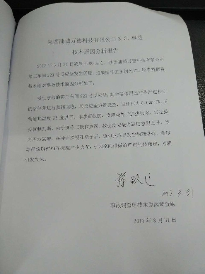 2017年3月31日凌晨3:00左右,蒲城萬德科技有限公司第三車間223反應(yīng)釜發(fā)生閃爆,引發(fā)第三車間著火,造成一起1名夜班工人死亡。事故發(fā)生后,該公司值班領(lǐng)導(dǎo)向公司領(lǐng)導(dǎo)進(jìn)行了報(bào)告,該公司立即啟動(dòng)了《生產(chǎn)安全事故應(yīng)急救援預(yù)案》,組織工人啟動(dòng)消防水泵進(jìn)行現(xiàn)場(chǎng)救援,組織廠區(qū)其他工人撤出生產(chǎn)廠區(qū),同時(shí)向110、119、120請(qǐng)求救援,向相關(guān)政府部門進(jìn)行了報(bào)告。接到報(bào)告后,縣公安局陳莊派出所、安監(jiān)局、蒲城高新區(qū)管委會(huì)、消防大隊(duì)、120急救部門第一時(shí)間趕到現(xiàn)場(chǎng)進(jìn)行救援處置,凌晨4時(shí)20分左右成功撲滅事故現(xiàn)場(chǎng)明火。隨后該公司組織在第三車間二樓平臺(tái)找到王崗的尸體,證實(shí)該名工人在爆炸中當(dāng)場(chǎng)死亡。