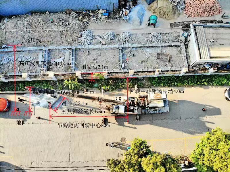 事故現(xiàn)場為余姚市姚靜金屬制品有限公司變壓器房改造工程工地,如圖1所示。工地東側(cè)為門衛(wèi)室,南側(cè)為圍墻,圍墻高2.1m,墻外為馬路,馬路靠近圍墻處上方有1萬伏高壓線穿過,距離地面11.5m。王相寧操作的汽車起重機(jī)停在馬路上進(jìn)行起重作業(yè),其回轉(zhuǎn)中心距離圍墻4.0m。