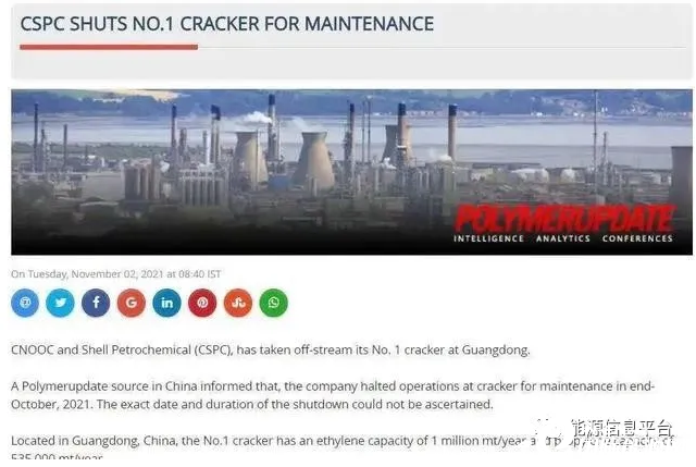 另外,中海油殼牌位于廣東的第一裂解裝置近日進入維修。消息人士透露,此次維護暫時無法確定關閉的確切日期和持續(xù)時間。該裂解裝置乙烯生產能力為100萬噸/年,丙烯生產能力為53.5萬噸/年。