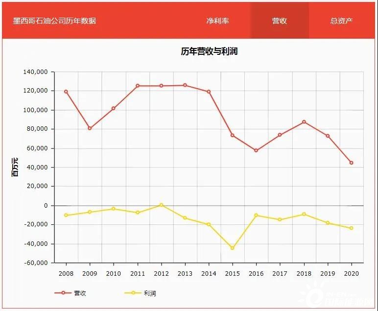 再看2008年至今的財(cái)報(bào)數(shù)據(jù),這一區(qū)間內(nèi)墨國油幾乎全部呈現(xiàn)虧損狀態(tài),2020年遭遇疫情嚴(yán)重沖擊,虧損額度更是高達(dá)230億美元。