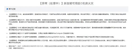 火災公告顯示,11日凌晨01:46,接當?shù)叵酪?,因消防澆水持續(xù)進行,機房開始出現(xiàn)積水和滲漏,電路存在短路風險,新加坡可用區(qū)C一棟機房大樓整體緊急斷電,可用區(qū)C其他大樓業(yè)務(wù)網(wǎng)絡(luò)已陸續(xù)恢復。